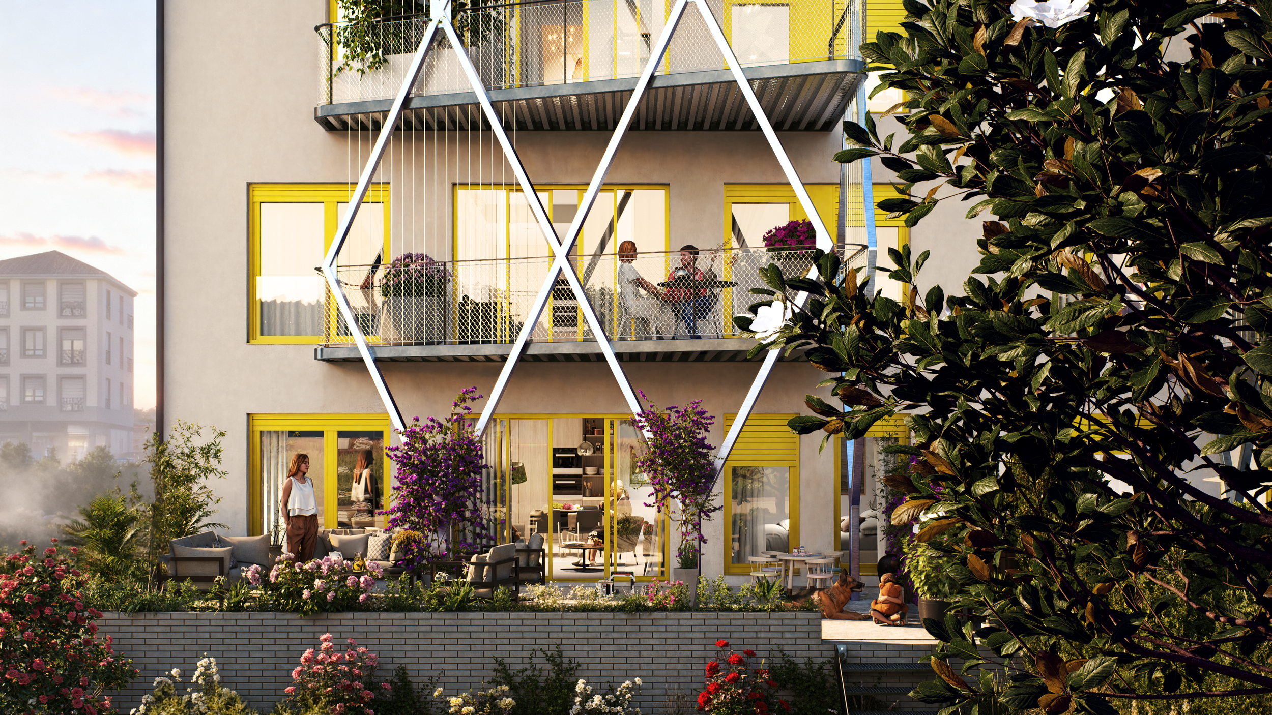En las fachadas este y oeste, que acogen los espacios centrales de las viviendas, se proyectan ventanales amplios y luminosos, acompañados de grandes terrazas que por su dimensión (14 m² aprox.) funcionan como una estancia más. Estas terrazas se resuelven con estructuras metálicas muy livianas, combinadas con mallas, tirantes y elementos vegetales que actúan como separadores naturales, aportando privacidad, sombra y una riqueza espacial que amplía la relación interior-exterior.